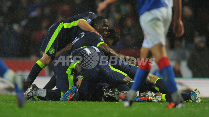 アントリン・アルカラス(Antolin Alcaraz)の得点を喜ぶウィガンの選手(2012年5月7日撮影)。(c)AFP/ANDREW YATES