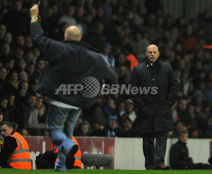ピッチに乱入した観客を見つめるブラックバーン・ローバーズのスティーヴ・キーン監督(Steve Kean、2012年5月7日撮影)。(c)AFP/ANDREW YATES