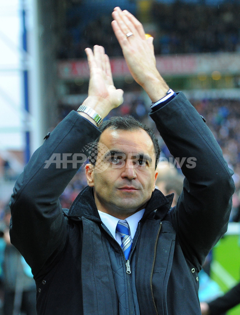試合前にサポーターの歓声に応えるウィガンのロベルト・マルティネス監督(Roberto Martinez、2012年5月7日撮影)。(c)AFP/ANDREW YATES