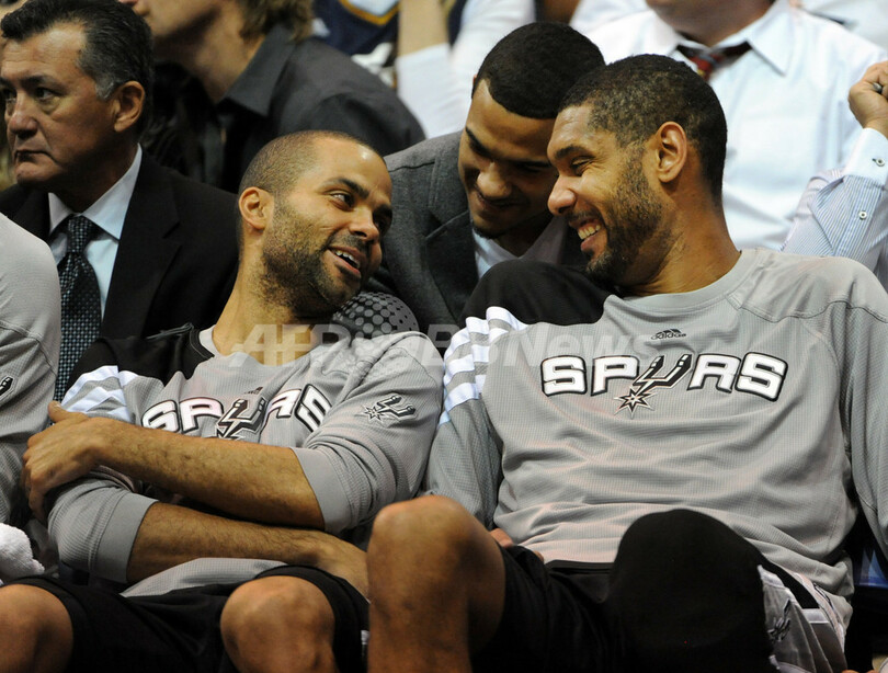 ベンチで笑顔を見せるサンアントニオ・スパーズのトニー・パーカー(Tony Parker、左)とティム・ダンカン(Tim Duncan、2012年5月7日撮影)。(c)AFP/Getty Images/Steve Dykes