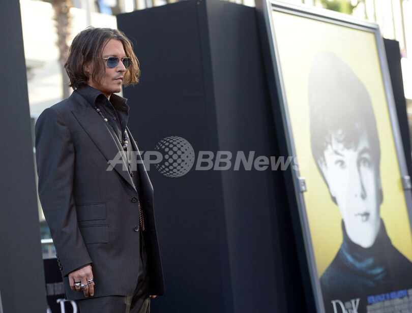 俳優ジョニー・デップ(Johnny Depp)とティム・バートン(Tim Burton)監督のコンビで製作された新作映画『ダーク・シャドウ(Dark Shadows)』のプレミア上映会が7日、米カリフォルニア(California)州ハリウッド(Hollywood)で開催され、出演者らが出席した。日本公開は19日。写真は、会場に到着したジョニー・デップ(2012年5月7日撮影)。(c)AFP/Getty Images/Kevin Winter