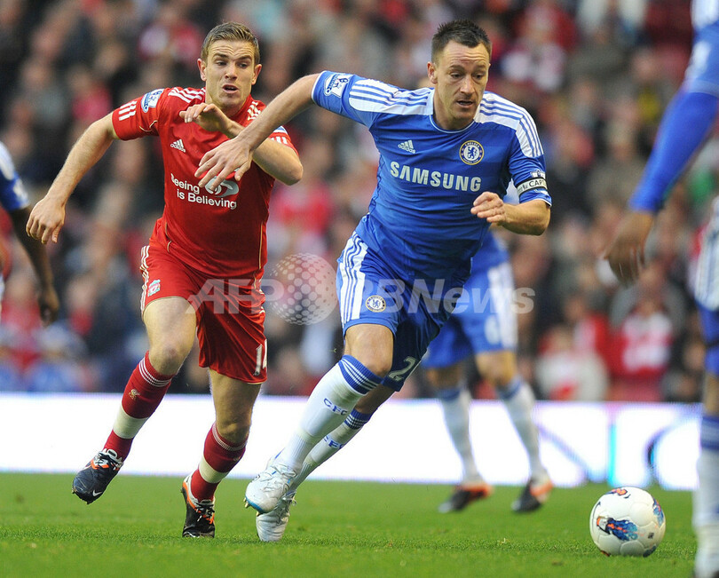 リバプールのジョーダン・ヘンダーソン(Jordan Henderson、左)とボールを追うチェルシーのジョン・テリー(John Terry、2012年5月8日撮影)。(c)AFP/PAUL ELLIS