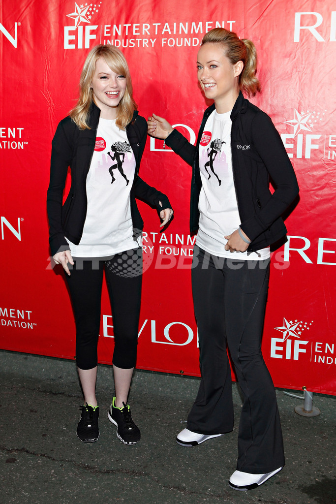 会場となったセントラルパークには、米化粧品メーカー「レブロン(Revlon)」のグローバル・ブランド・アンバサダーを務める女優のエマ・ ストーン(Emma Stone)とオリヴィア・ワイルド(Olivia Wilde)が登場し、イベントを盛り上げた。収益金は、乳がん、卵巣がんの研究に役立てられる。(c)AFP/Getty Images