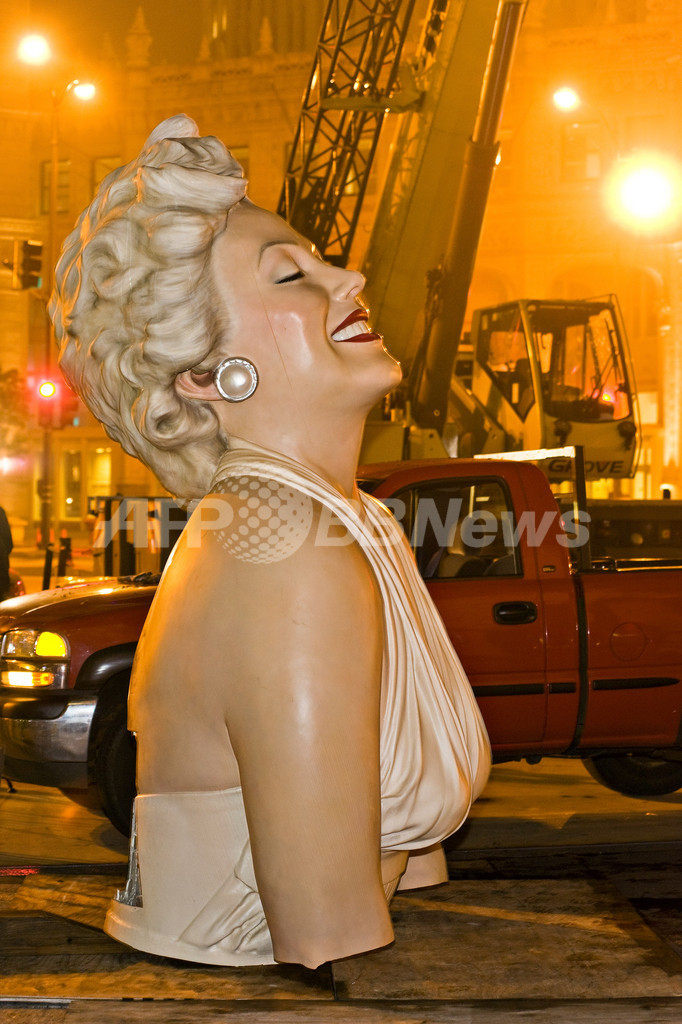 米イリノイ(Illinoi)州シカゴ(Chicago)の街角に立っていた巨大なマリリン・モンロー(Marilyn Monroe)のフィギュアが7日、カリフォルニア(California)州パームスプリングズ(Palm Springs)への搬送に向けて解体・撤去された(2012年5月7日撮影)。(c)AFP/Getty Images/Timothy Hiatt