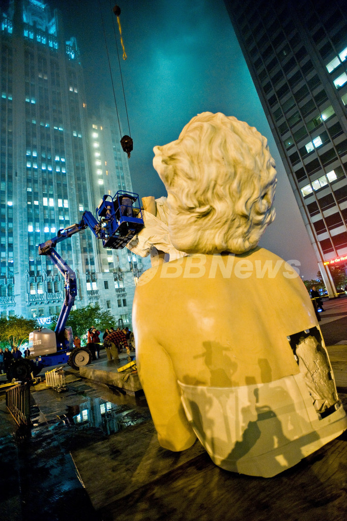 米イリノイ(Illinoi)州シカゴ(Chicago)の街角に立っていた巨大なマリリン・モンロー(Marilyn Monroe)のフィギュアが7日、カリフォルニア(California)州パームスプリングズ(Palm Springs)への搬送に向けて解体・撤去された(2012年5月7日撮影)。(c)AFP/Getty Images/Timothy Hiatt