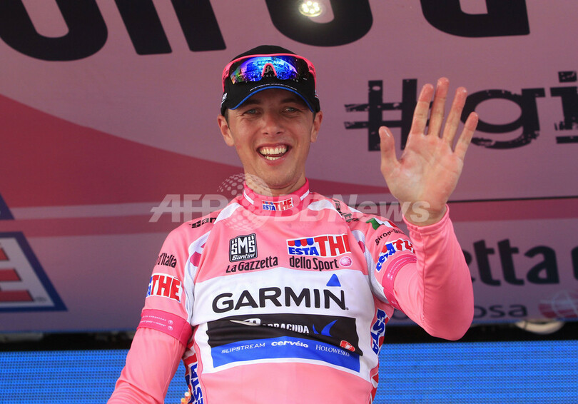 総合首位(マリア・ローザ)を守り、表彰式に臨むガーミン・バラクーダ(Garmin Barracuda)のラムナス・ナヴァルダスカス(Ramunas Navardauskas、2012年5月10日撮影)。(c)AFP/LUK BENIES