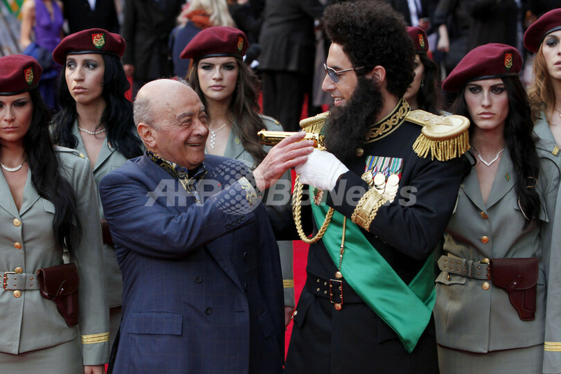 英俳優サシャ・バロン・コーエン(Sacha Baron Cohen)が独裁者を演じた新作コメディ『ディクテーター 身元不明でニューヨーク(The Dictator)』のUKプレミアが10日、ロンドン(London)で開催された。写真は、レッドカーペットに登場したコーエンとエジプト人富豪のモハメド・アルファイド(Mohamed Al-Fayed)氏(2012年5月10日撮影)。(c)AFP/TAL COHEN