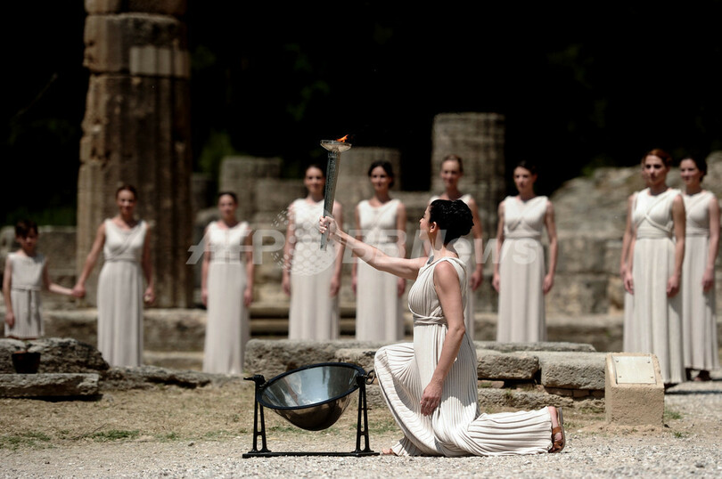 オリンピアで行われた式典では、2600年の歴史を持つヘラ(Hera)神殿の前で太陽神アポロ(Apollo)にふんした俳優が、凹面鏡を使用して太陽光線から採光した。