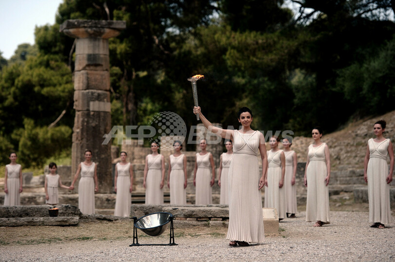 オリンピアで行われた式典では、2600年の歴史を持つヘラ(Hera)神殿の前で太陽神アポロ(Apollo)にふんした俳優が、凹面鏡を使用して太陽光線から採光した。