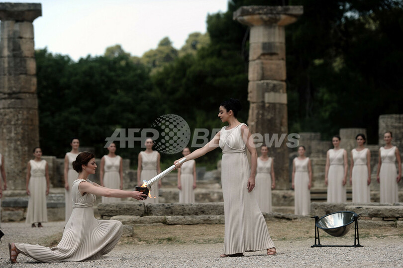 オリンピアで行われた式典では、2600年の歴史を持つヘラ(Hera)神殿の前で太陽神アポロ(Apollo)にふんした俳優が、凹面鏡を使用して太陽光線から採光した。