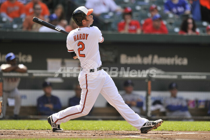初回に本塁打を放つボルティモア・オリオールズのJ.J.ハーディ(JJ Hardy、2012年5月10日撮影)。(c)AFP/Getty Images/Mitchell Layton