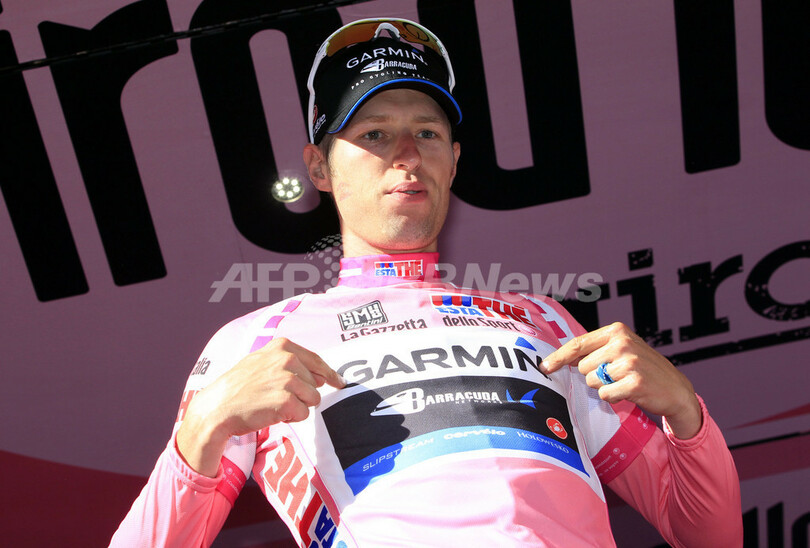 総合首位(マリア・ローザ)に浮上し、表彰式に臨むガーミン・バラクーダ(Garmin Barracuda)のライダー・ヘシェダル(Ryder Hesjedal、2012年5月12日撮影)。(c)AFP/LUK BENIES