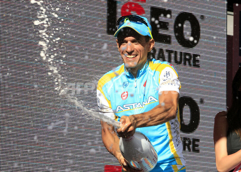 表彰式でシャンパンスプレーを浴びせるアスタナ(Astana)のパオロ・ティーラロンゴ(2012年5月12日撮影)。(c)AFP/LUK BENIES