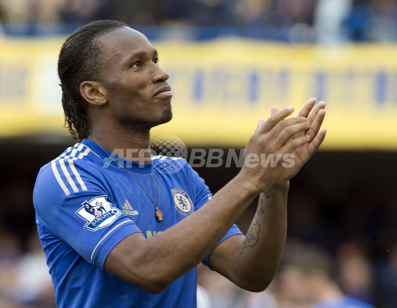 試合後、サポーターの歓声に応えるチェルシーのディディエ・ドログバ(Didier Drogba、2012年5月13日撮影)。(c)AFP/MIGUEL MEDINA