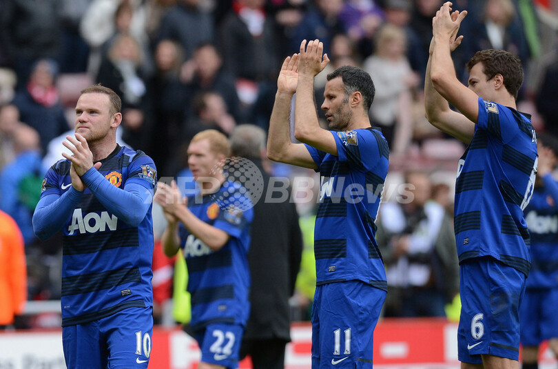 試合後、サポーターの歓声に応えるマンチェスター・ユナイテッドの選手(2012年5月13日撮影)。(c)AFP/ANDREW YATES