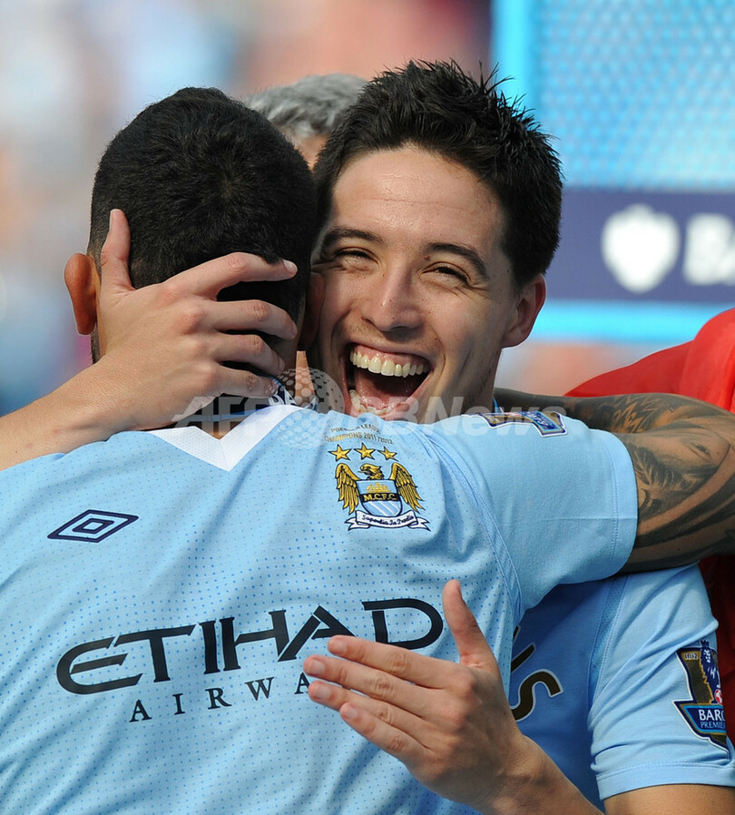 優勝を果たし、カルロス・テベス(Carlos Tevez、左)と喜ぶマンチェスター・シティのサミル・ナスリ(Samir Nasri、2012年5月13日撮影)。(c)AFP/PAUL ELLIS