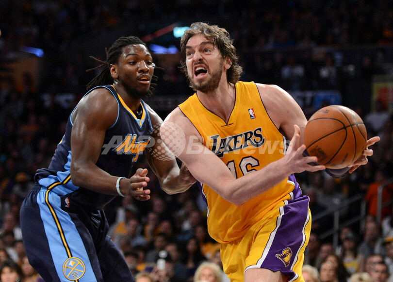 ナゲッツのケネス・フェリード(Kenneth Faried)をかわすレイカーズのパウ・ガソル(Pau Gasol、2012年5月12日撮影)。(c)AFP/Getty Images/Harry How