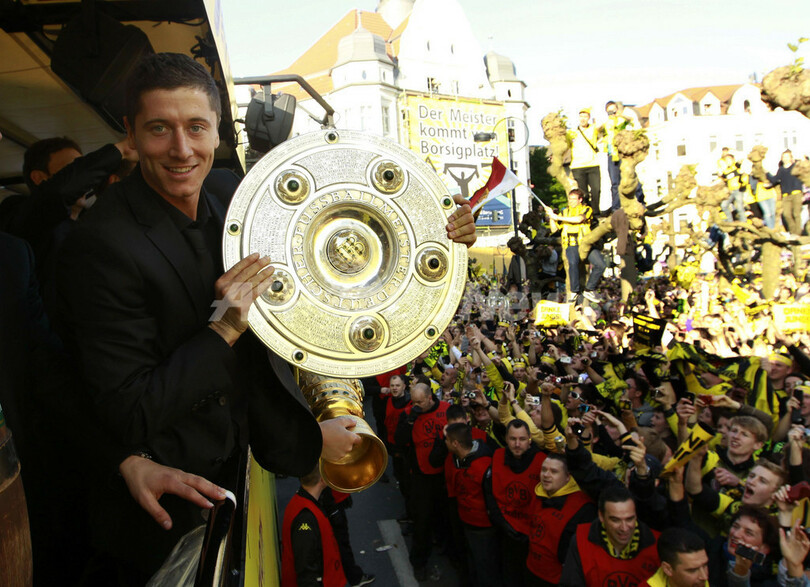パレードでトロフィーを掲げるロベルト・レワンドフスキ(Robert Lewandowski、2012年5月13日撮影)。(c)AFP/INA FASSBENDER
