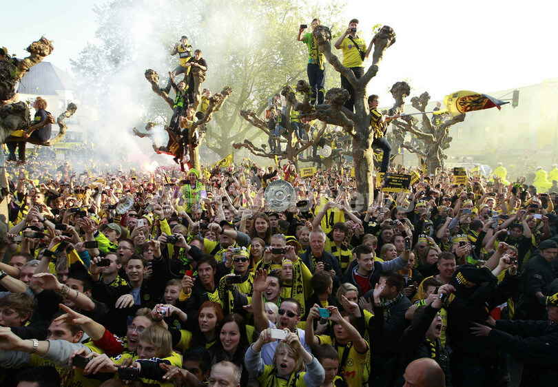 パレードで歓喜するボルシア・ドルトムントのファン(2012年5月13日撮影)。(c)AFP/INA FASSBENDER