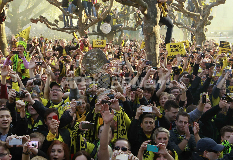 パレードで歓喜するボルシア・ドルトムントのファン(2012年5月13日撮影)。(c)AFP/INA FASSBENDER