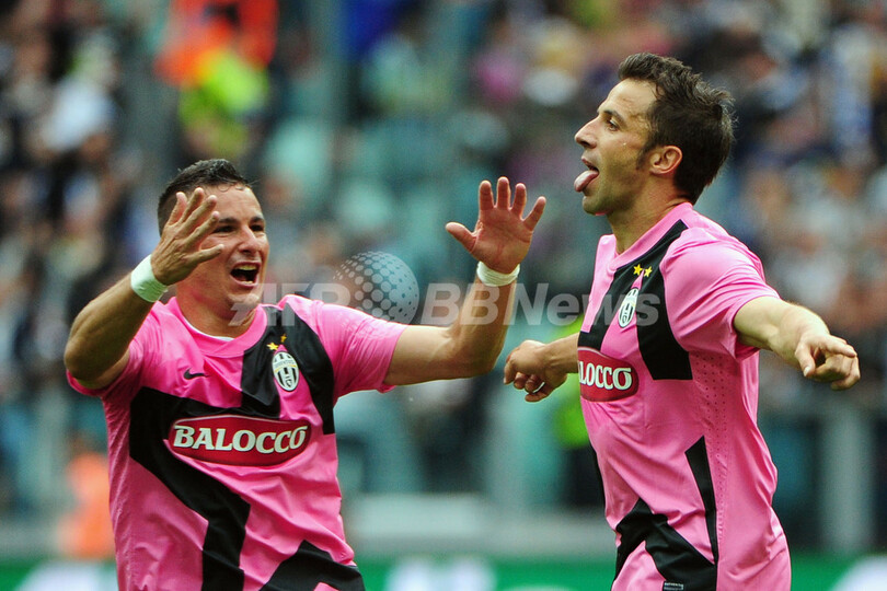 前半28分に得点を挙げ、歓喜するユベントスのアレッサンドロ・デル・ピエロ(Alessandro Del Piero、右、2012年5月13日撮影)。(c)AFP/OLIVIER MORIN