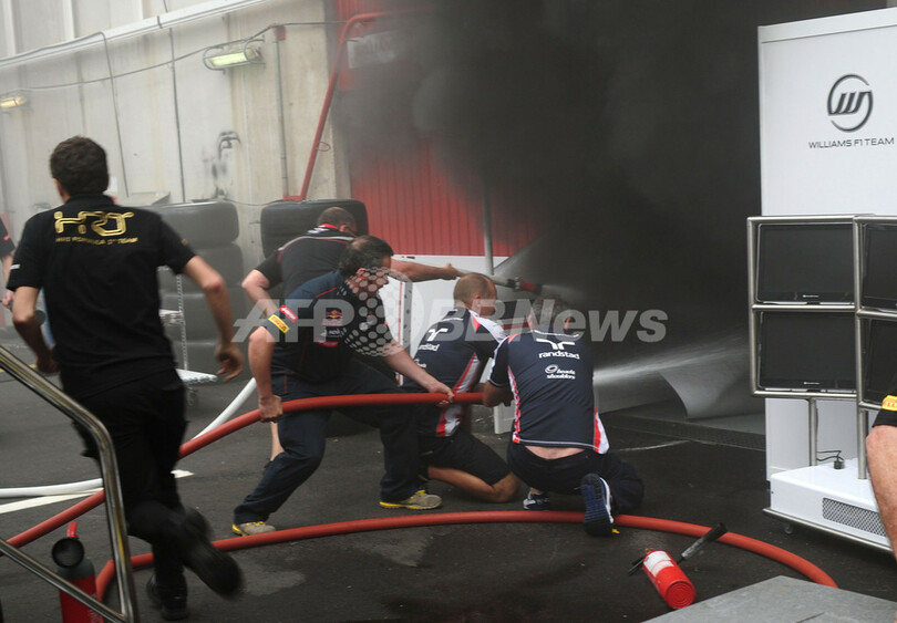 【5月14日 AFP】13日に行われた12F1第5戦スペインGP(Spanish Grand Prix 2012)のレース後、優勝を飾ったパストール・マルドナド(Pastor Maldonado)が所属するウィリアムズ(Williams)のガレージで火事が起きた。