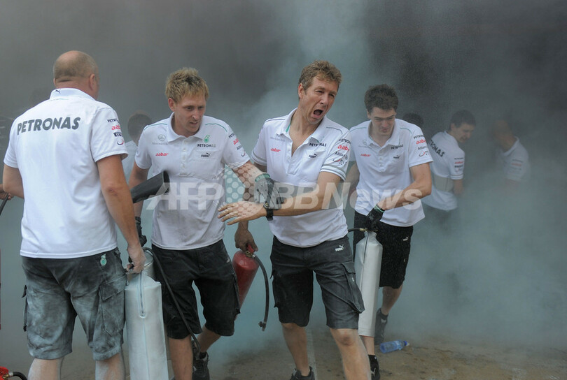 消火活動に参加するメルセデスGP(Mercedes GP)のチームクルー(2012年5月13日撮影)。(c)AFP/JOSEP LAGO