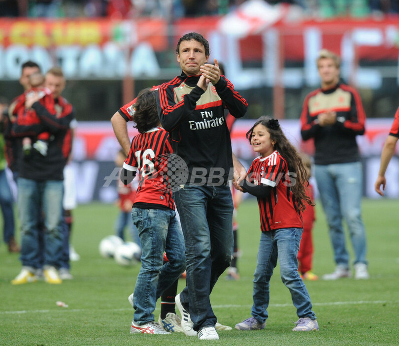 試合後のピッチ上で観衆の声援に応えるミランのマルク・ファン・ボメル(Mark Van Bommel、2012年5月13日撮影)。(c)AFP/ALBERTO LINGRIA