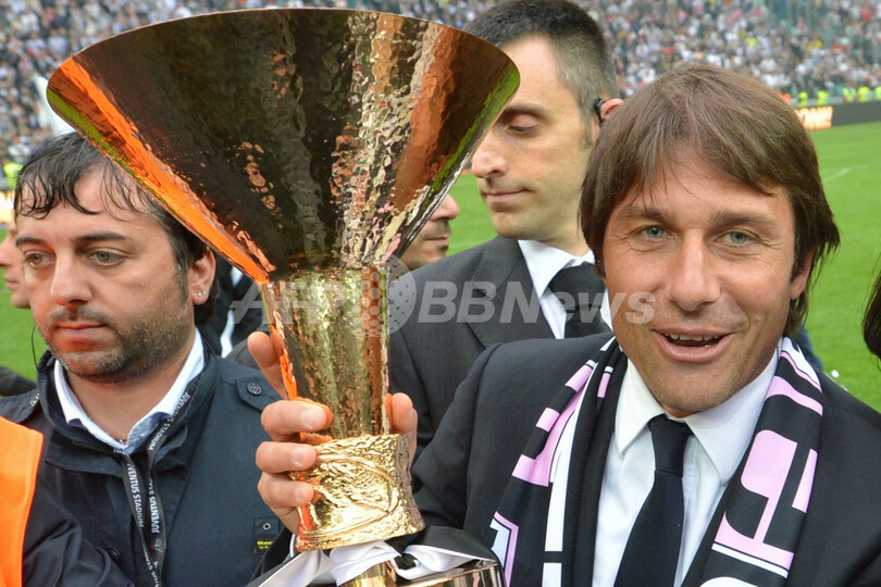 試合後に行われたセレモニーでトロフィーを掲げるユベントスのアントニオ・コンテ(Antonio Conte)監督(2012年5月13日撮影)。(c)AFP/GIUSEPPE CACACE