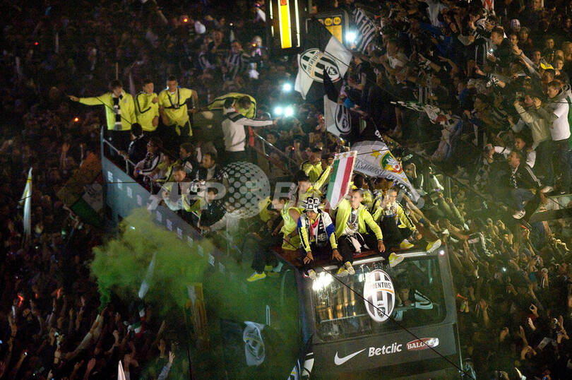 試合後にトリノ(Turin)市内で行われた優勝パレードに参加するユベントスの選手(2012年5月13日撮影)。(c)AFP/GIUSEPPE CACACE
