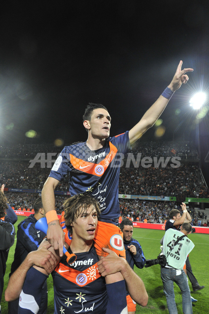 試合に勝利し歓喜するモンペリエの選手(2012年5月13日撮影)。(c)AFP/BORIS HORVAT