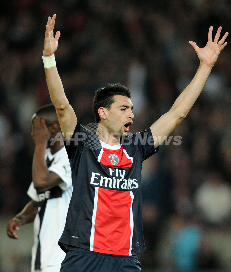 判定に不満を表すパリ・サンジェルマンのハビエル・パストレ(Javier Pastore、2012年5月13日撮影)。(c)AFP/FRANCK FIFE