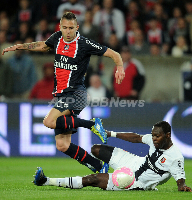 レンヌのオニェカチ・アパム(Onyekachi Apam)のスライディングタックルを受けるパリ・サンジェルマンのジェレミ・メネス(Jeremy Menez、2012年5月13日撮影)。(c)AFP/FRANCK FIFE