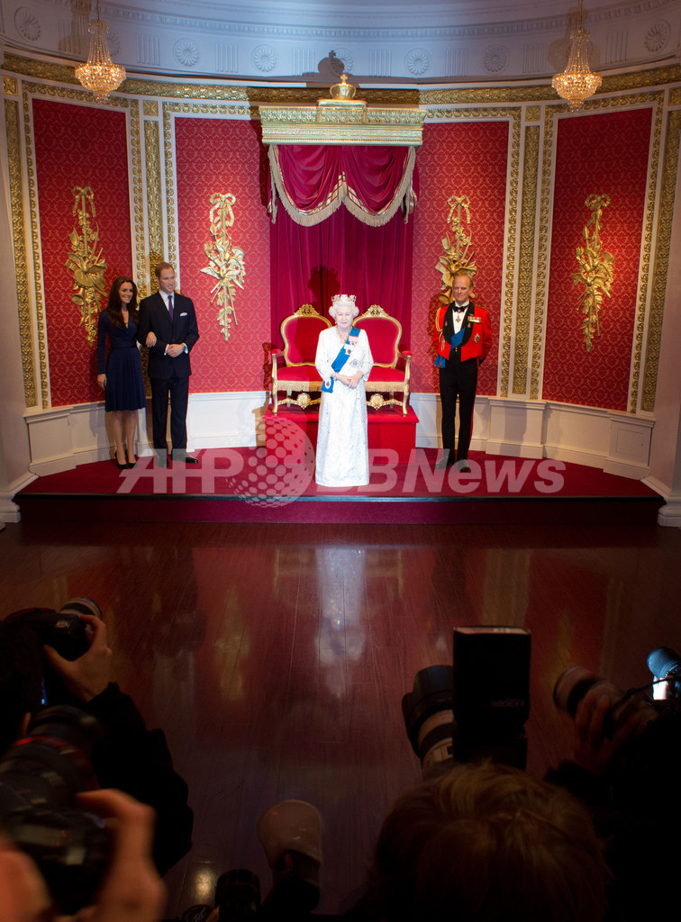 写真はろう人形館に飾られたエリザベス女王(右から2人)、フィリップ殿下(Prince Philip、右)、ウィリアム王子(Prince William、左から2人目)、キャサリン妃(Catherine, Duchess of Cambridge、左)のろう人形(2012年5月14日撮影)。(c)AFP/LEON NEAL