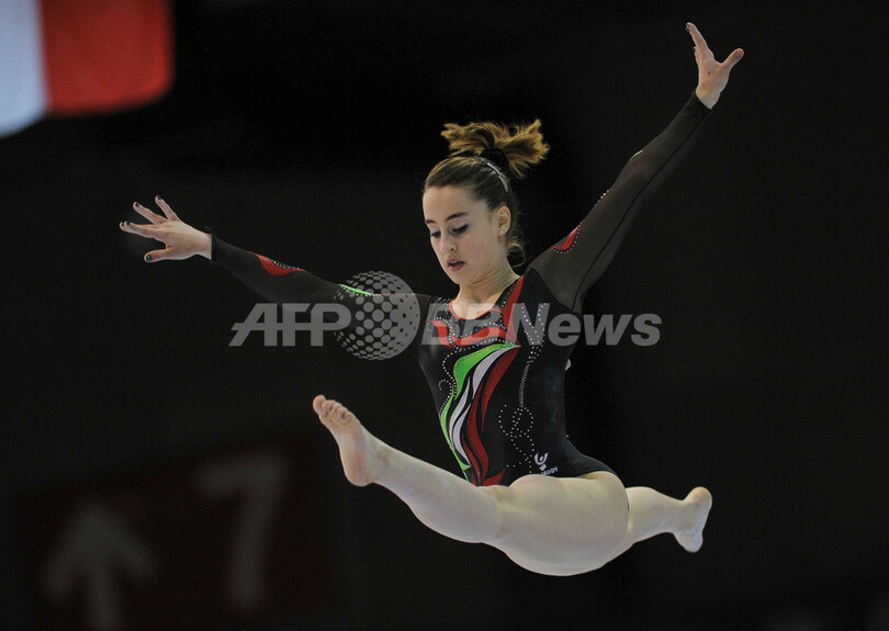 床運動で演技を披露するイタリアのカルロッタ・フェリート(Carlotta Ferlito、2012年5月10日撮影)。(c)AFP/JOHN THYS