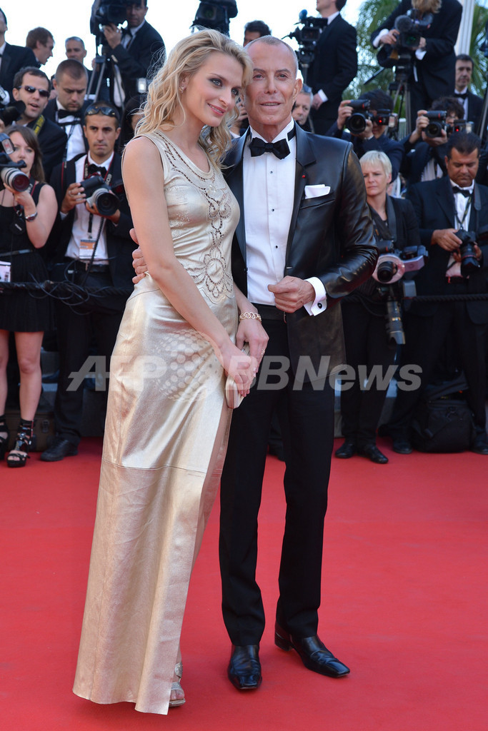 写真は、オープニングのレッドカーペットに登場したファッションデザイナーのジャン・クロード・ジトロワ(Jean-Claude Jitrois、右)とフランス人モデルのサラ・マーシャル(Sarah Marshall、2012年5月16日撮影)。(c)AFP/ALBERTO PIZZOLI