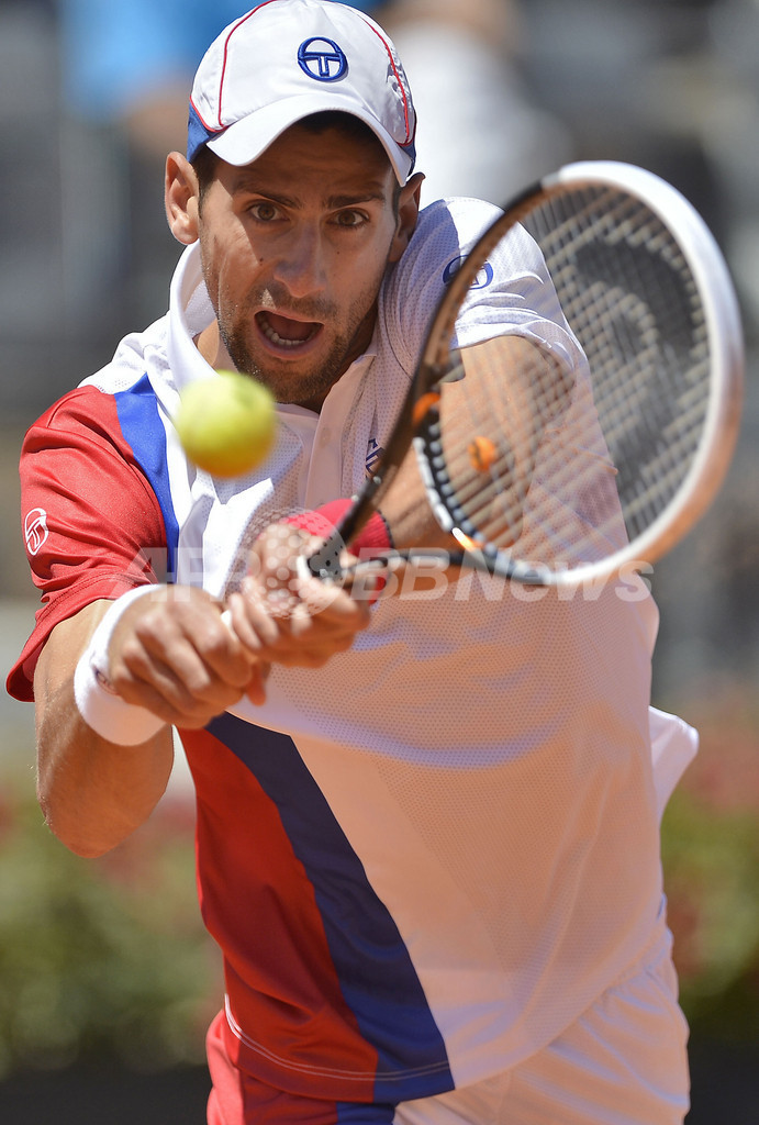 リターンを打つノバク・ジョコビッチ(2012年5月17日撮影)。(c)AFP/Filippo MONTEFORTE