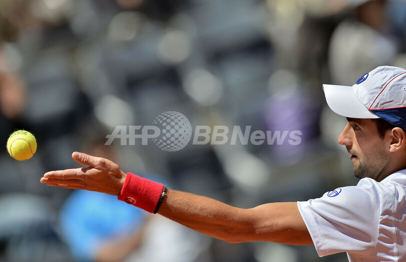 サーブトスを上げるノバク・ジョコビッチ(2012年5月17日撮影)。(c)AFP/Filippo MONTEFORTE