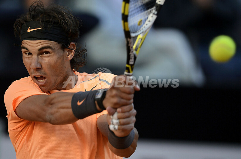 リターンを打つラファエル・ナダル(2012年5月17日撮影)。(c)AFP/Filippo MONTEFORTE