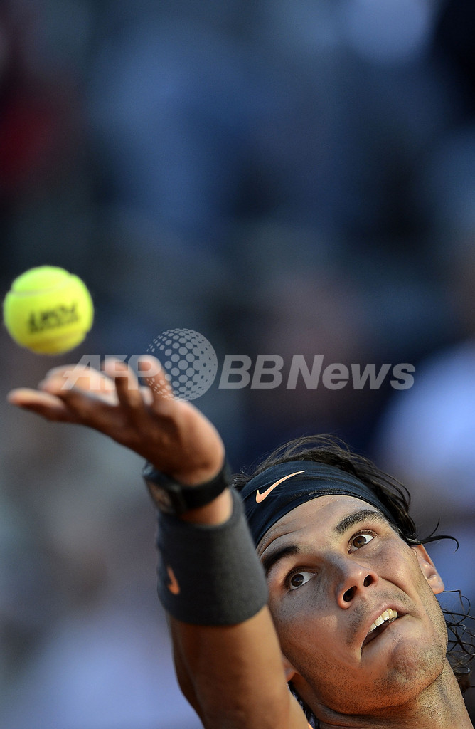 サーブトスを上げるラファエル・ナダル(2012年5月17日撮影)。(c)AFP/Filippo MONTEFORTE