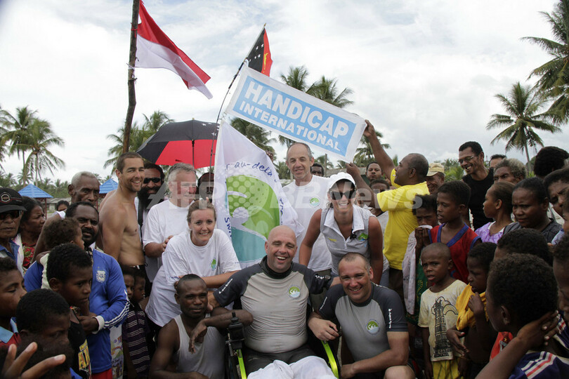 フィン付きの義肢を使い挑戦を行うフィリップ・クロワゾン(Philippe Croizon)さん(43)は、パプアニューギニアのWutung村を出発し、7時間半かけてインドネシア・パプア(Papua)州のPasar Skow村に到着した。