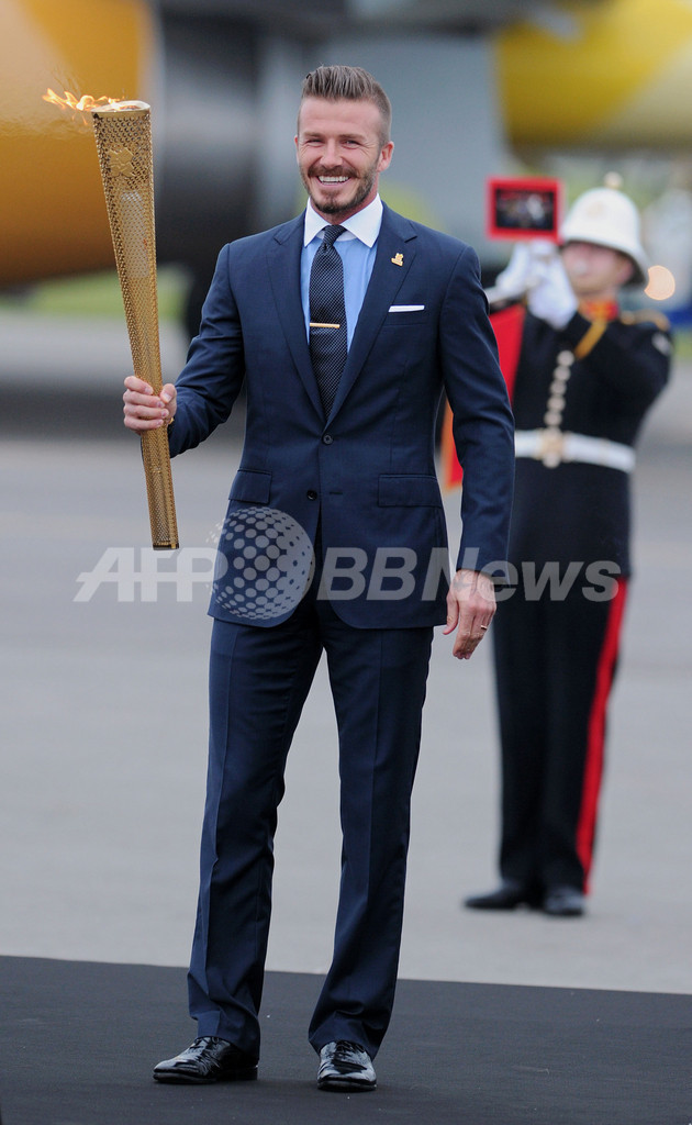 トーチを持つサッカー元イングランド代表のデビッド・ベッカム(David Beckham、2012年5月18日撮影)。(c)AFP/CARL COURT