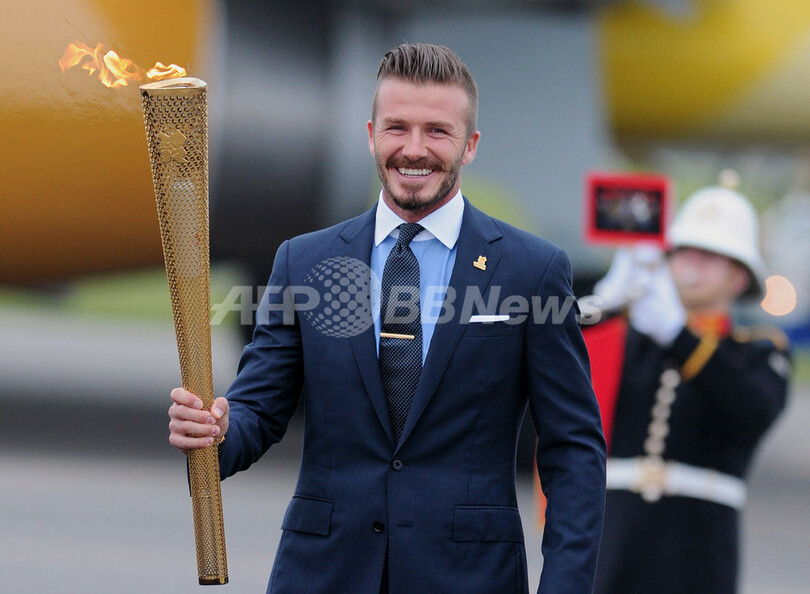 トーチを持つサッカー元イングランド代表のデビッド・ベッカム(David Beckham、2012年5月18日撮影)。(c)AFP/CARL COURT
