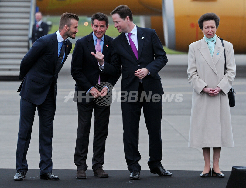 会話を交わす(左から)サッカー元イングランド代表のデビッド・ベッカム(David Beckham)、ニック・クレッグ(Nick Clegg)副首相、ロンドン五輪組織委員会のセバスチャン・コー(Sebastian Coe)会長、アン王女(Princess Anne、2012年5月18日撮影)。(c)AFP/CARL COURT