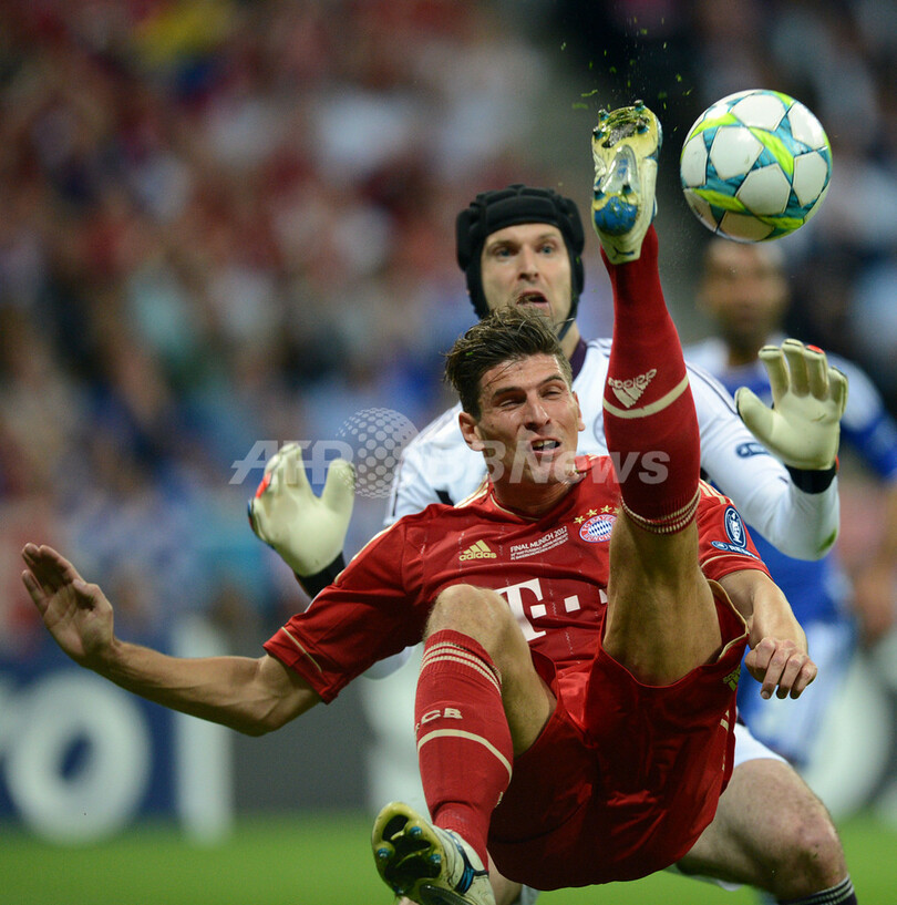 チェルシーのGKペトル・チェフ(Petr Cech、奥)の前でシュートを狙うバイエルン・ミュンヘンのマリオ・ゴメス(Mario Gomez、2012年5月19日撮影)。(c)AFP/ADRIAN DENNIS