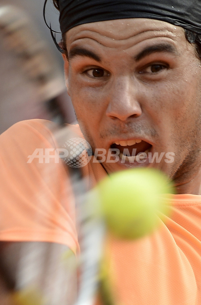 リターンを打つラファエル・ナダル(2012年5月19日撮影)。(c)AFP/FILIPPO MONTEFORTE