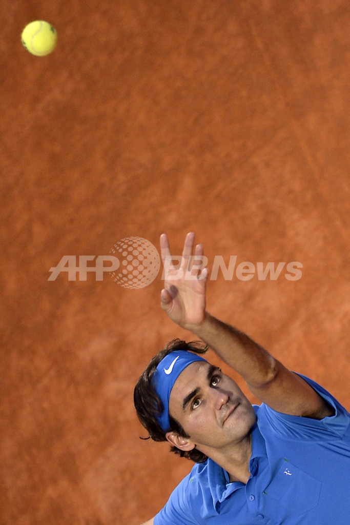 サーブトスを上げるロジャー・フェデラー(2012年5月19日撮影)。(c)AFP/FILIPPO MONTEFORTE