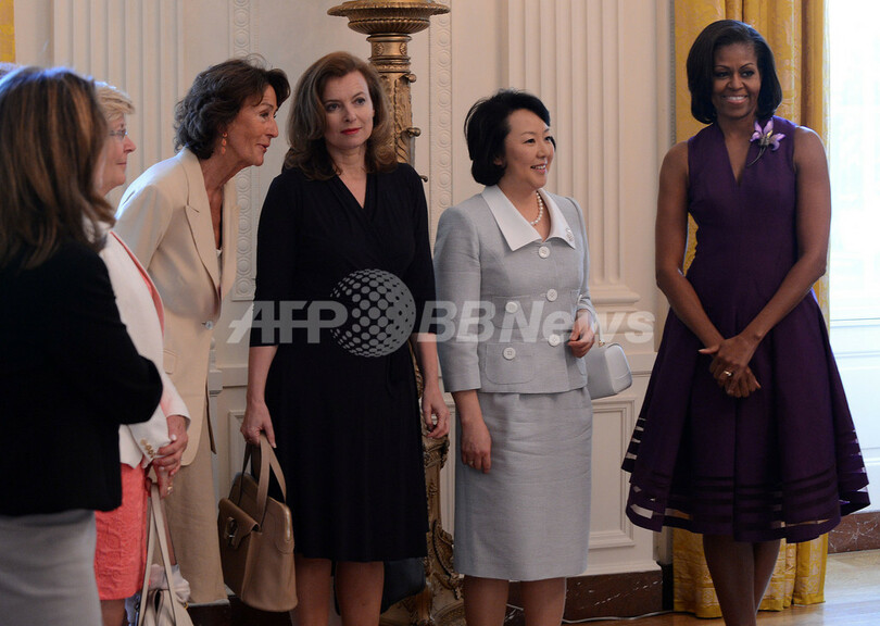 フランソワ・オランド(Francois Hollande)仏新大統領のパートナー、トリルベレールさんは、ひざ丈の黒のラップドレスにハンドバッグと黒いヒールを合わせた服装。ミシェル・オバマ(Michelle Obama)米大統領夫人の案内でホワイトハウス(White House)のイーストルーム(East Room)を見学し、各国首脳夫人らと交流した。