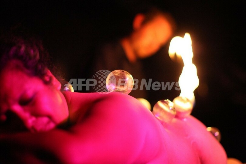 写真は、「地下牢パーティー」で服従を望む参加者の女性背に肌を吸引する火のついた瓶を乗せる男性(2012年5月18日撮影)。(c)AFP/Getty Images/David McNew