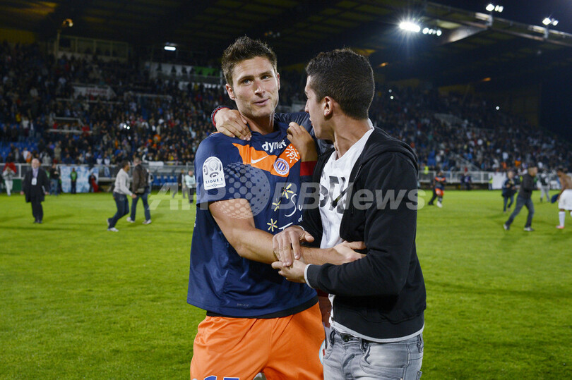 優勝に歓喜するモンペリエのオリヴィエ・ジルー(Olivier Giroud、左、2012年5月20日撮影)。(c)AFP/JEFF PACHOUD